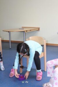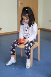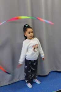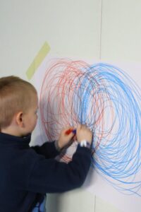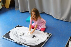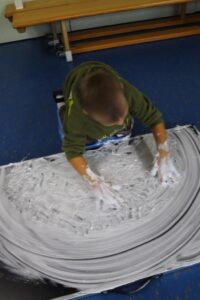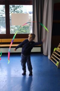 Auch beschäftigten wir uns mit Schwungübungen. Dazu benutzen wir unterschiedliche Materialien, wie Gymnastikbänder, Wachsmalstifte und Rasierschaum.
