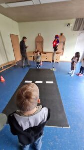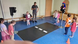 Gemeinsam mit dem ADAC bieten wir ein Verkehrstraining für die Schultiger. Herr Lehmann und Adacus haben uns mit einem Straßenteppich und einer Ampelanlage besucht. Erst sprachen wir über gefährliche Situationen und dann durften die Kinder als Autos oder als Fußgänger über die Straße gehen.